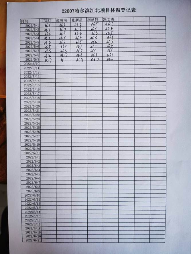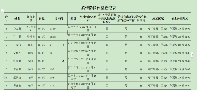 每天出工前和收工后进行体温量测,到达现场后先进行84消毒液现场消毒,项目部每天上午和下午各进行室内消毒各一次,同时按防疫要求配合防疫核酸检测(社区定时通知)。