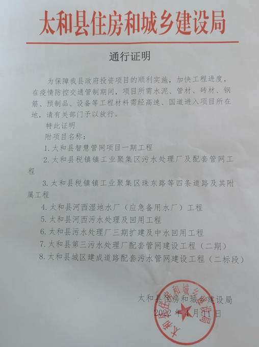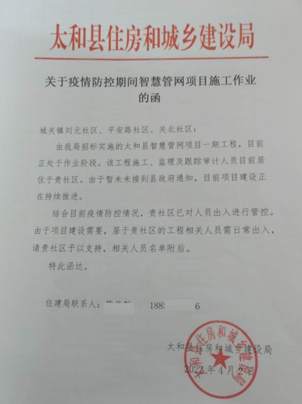 疫情发生后,项目经理陈小辉及时与业主单位太和县住房和城乡建设局沟通,办理进出小区的证明,保证项目正常作业,确保普查检测工作的顺利推进。同时,为了确保非开挖修复工作的顺利开展办理了材料进入县城的通行证明。