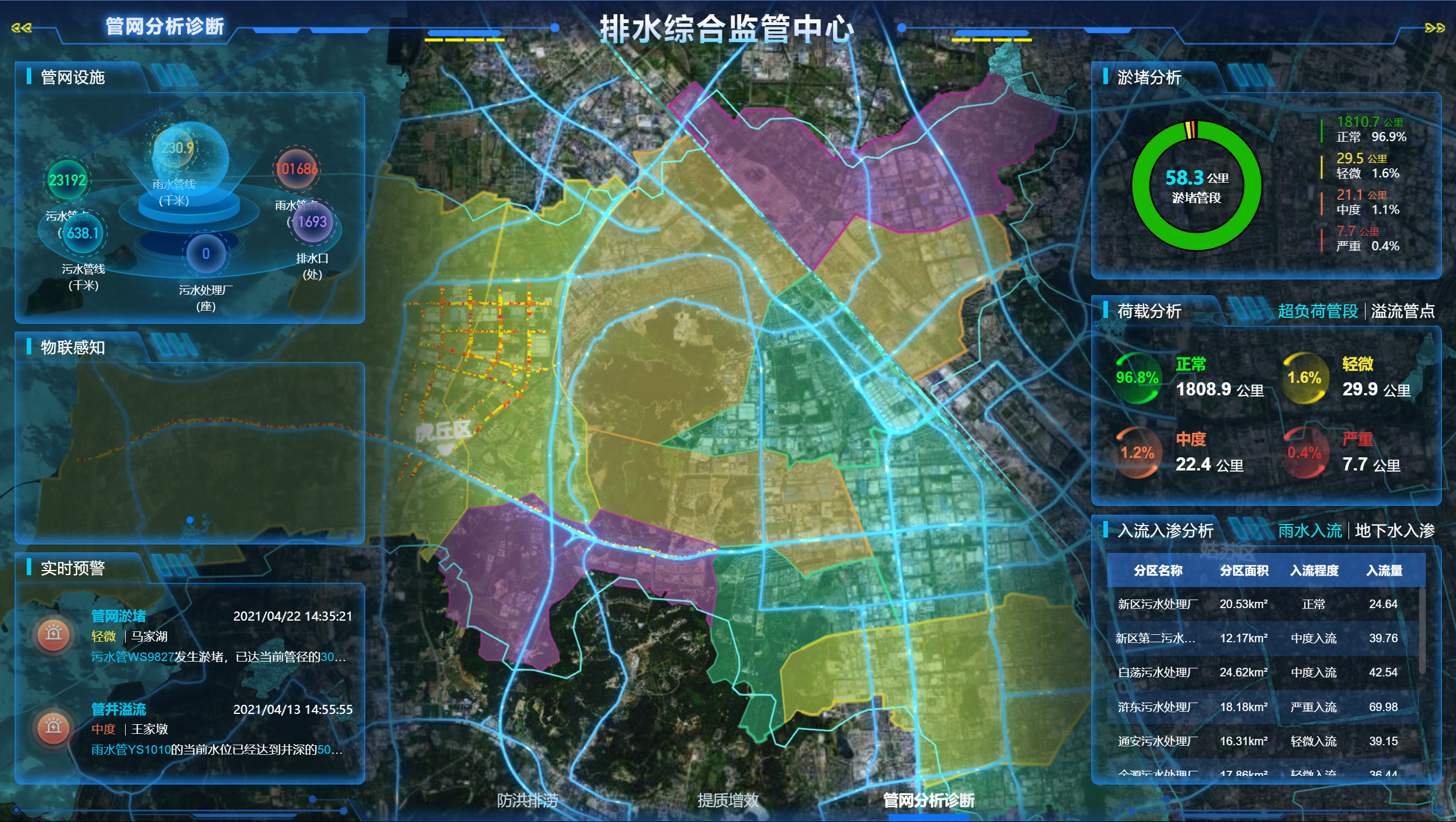 智慧排水解决方案:围绕污水提质增效目标和防汛应急业务痛点,平战结合,打造涵盖排水全要素、全业务管理的“源、网、站、厂、口”监管体系,满足日常管理、提质增效、灾情预判、防汛调度、应急抢险等功能需要,实现排水管理高效化,提质增效精准化。