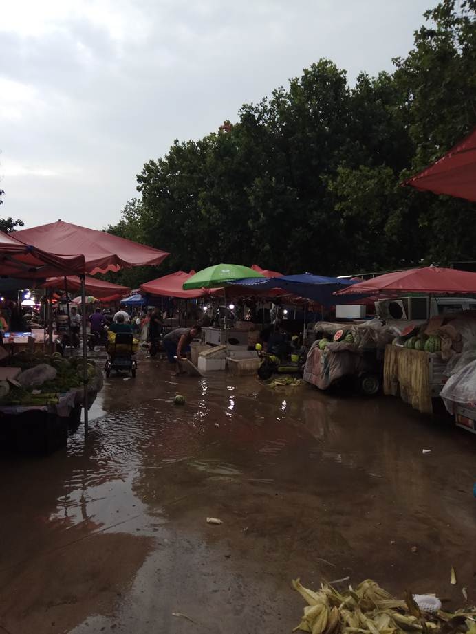 对于生意人来说,不会休息,一般也没有休息。夏天的周末,雨水过后,心里在犹豫着,菜市是否有人,还能不能买上菜?等到了市场,顾客是少了一些,但是,菜摊大多还在,小贩把盖着的塑料布掀开一角,露出里面各色的蔬菜,等待人们的挑选。那些固定摊位,因为有遮雨的房间和顶棚,蔬菜、食品照常摆放,不受影响。