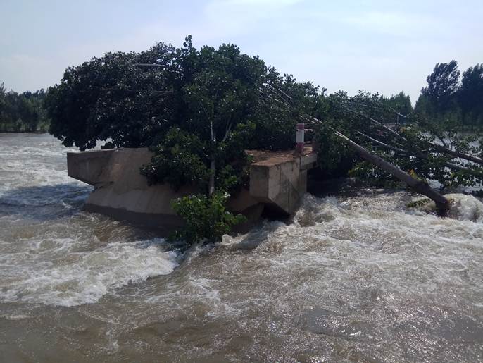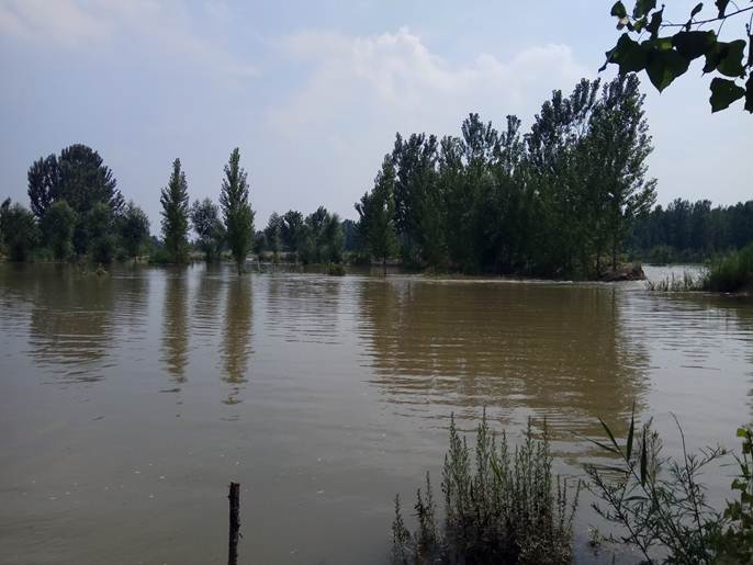 据说上游水库以每秒200立方米的水量泄洪,流经到我们这里时,还是发出了轰鸣般的水声,颜色有点浑浊,水花、漩涡不停地翻滚,就是没有人看着,也不会有人下水去试试了。站在岸边,沙子不时地被冲刷、掉落、带走,沿着岸边走了走,水量似乎略微变小,岸边低洼处,曾经进过水的地方,正在变得干涸。
