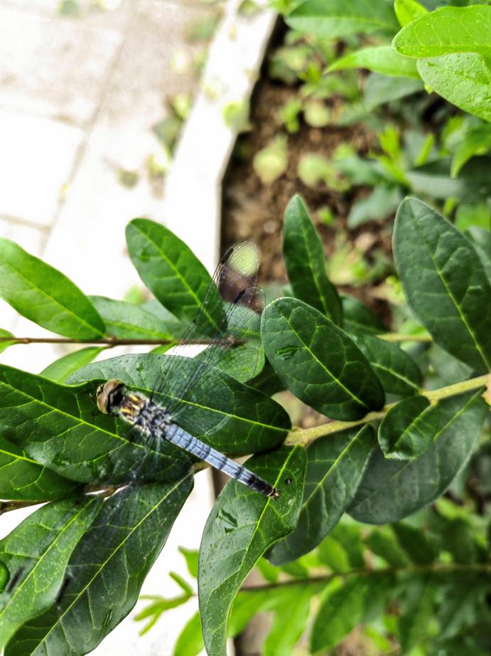 细细的雨丝不时飘落,天上的云在流动,人们根据自己的经验,在不紧不慢的溜达着。停留间,偶然发现了一个小蜻蜓,青灰色,停留在树叶上,随风摇曳,展开的翅膀,几近透明。或许是和游人一样,累了,停下来歇一歇,也或许是人家有自己的事情,总之,你尽管拍照,即便是说话大点儿声,也没关系。